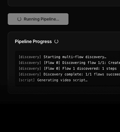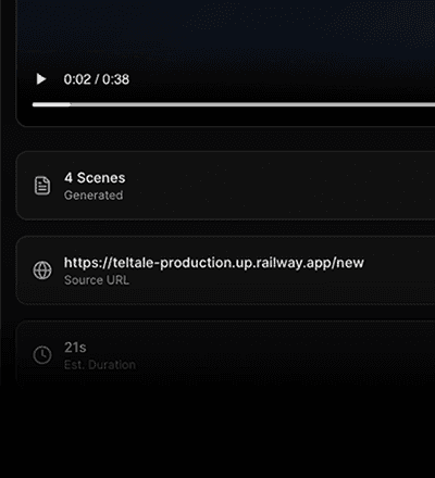 Paste a link. Describe the flow. Teltale explores your product autonomously and generates a polished, branded video: interactions, narration, and graphics included. No screen recording. No time wasted.
